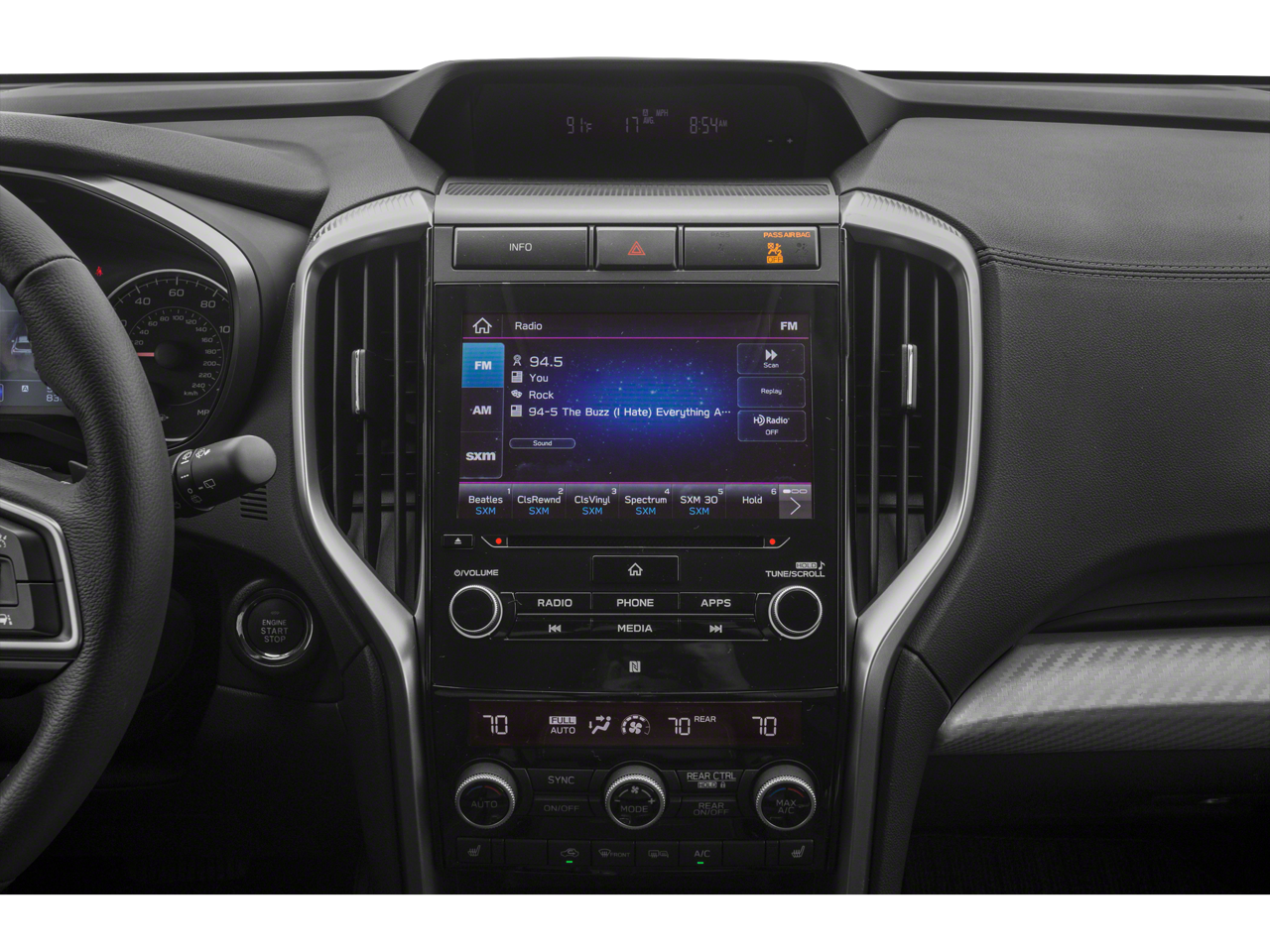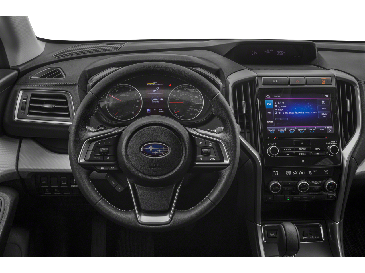 - Radio: Subaru STARLINK con sistema plus para multimedios de 8 plg -incluye: radio HD AM/FM estéreo con reproductor de CD de un disco, compatibilidad con archivos MP3/WMA/CRR/RW, pantalla táctil LCD de alta resolución con gestos multitáctiles, controles activados por voz para radio y navegación, conectividad de audio por difusión Bluetooth, conectividad de teléfono a manos libres Bluetooth, conectividad de mensajería de texto SMS a manos libres Bluetooth (aplicable con teléfono celular compatible), Near Field Communication (NFC), compatibilidad para control del iPod, compatibilidad para control del iPod, All-Access de radio satélite SiriusXM (requiere suscripción), información de viaje SiriusXM Travel Link (requiere suscripción), integración de teléfonos inteligentes para con función Aha, Android Auto, CarPlay de Apple y Pandora, aplicaciones STARLINK en la nube, controles en el volante para audio y Bluetooth, 6 altavoces, enchufe de entrada auxiliar de 3.5 mm delanteros y traseros, dos entradas USB