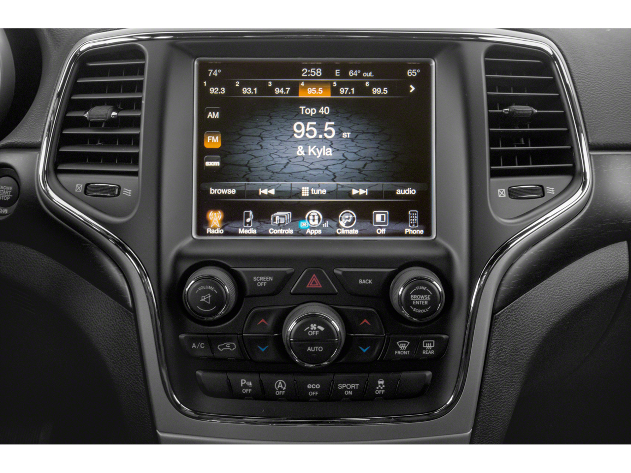 - Radio con búsqueda y barrido, reloj, volumen compensado por la velocidad, entrada auxiliar de audio, activación por voz, sistema de radio datos y control de memoria externa Uconnect