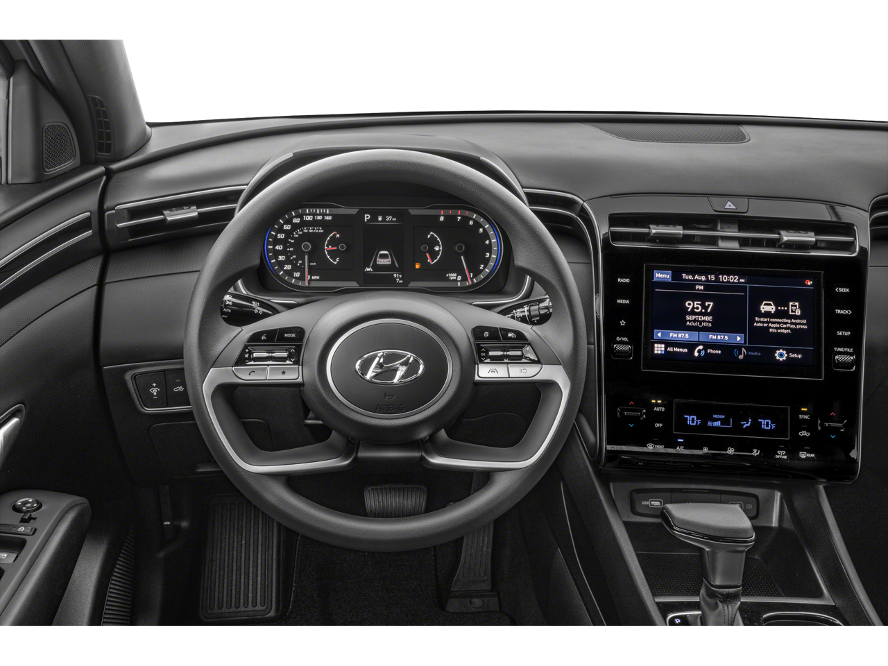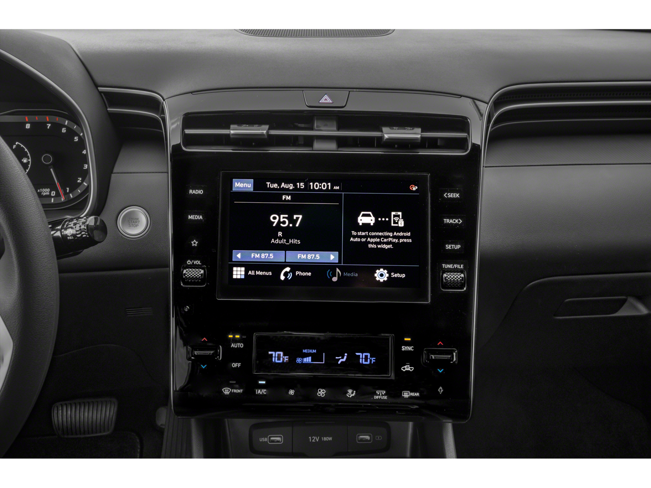 - Radio: Sistema de audio AM/FM/HD -incluye: pantalla táctil a color de 8 plg, 6 altavoces, radio satélite SiriusXM con suscripción de prueba de 3 meses, sistema de vehículo conectado Bluelink +, Bluetooth a manos libres con difusión de audio inalámbrica, Apple CarPlay y Android Auto con cable, y conectividad USB